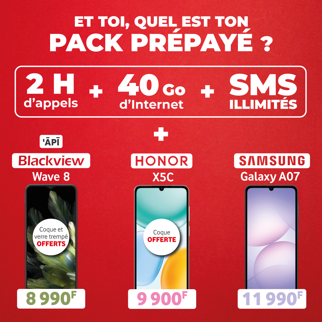 Les 2H d’appels et les SMS illimités sont locaux. Ces packs sont rechargeables avec des recharges Vodacard 500; DAS Wave 8 : 0,36 W/kg, X5c : 0,69 W/kg, Galaxy A07 : 0,19 W/kg Les appels et les SMS sont locaux. Ces packs sont rechargeables avec des recharges Vodacard 500. Crédit Internet disponible sur Tahiti, Moorea, Bora Bora, Raiatea et Huahine. Dans la limite des stocks disponibles. Photos non contractuelles. Conditions générales et spécifiques de vente sur www.vodafone.pf