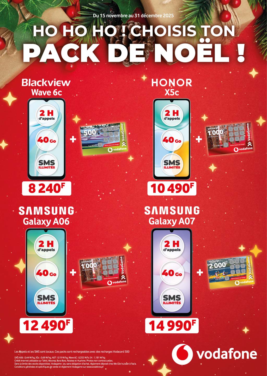 Les 2H d’appels et les SMS illimités sont locaux. Ces packs sont rechargeables avec des recharges Vodacard 500; DAS A06 : 0,44 W/kg, A07 : 0,19 W/kg, Wave 6C : 0,352 W/kg, X5c : 0,69 W/kg. Photos non contractuelles. Dans la limite des stocks disponibles. Conditions générales et spécifiques de vente ici
